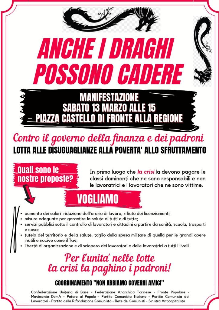 Anche i Draghi possono cadere. Manifestazione unitaria a Torino in Piazza Castello oggi. Il video.